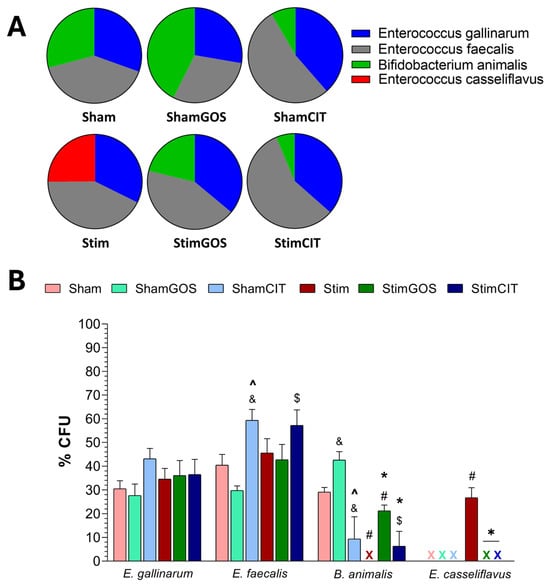 The most abundant bacterial species grown on the BSM medium (% of the total CFU of all identified species) in the gut microbiota of rats from individual experimental groups (A). Effects of GOS supplementation or CIT administration on the percentage (% of the total CFU) of the most abundant bacterial species (grown on the BSM medium) in the gut microbiota of rats subjected to long-term electrical stimulation of the CeA or sham stimulation (B). Data are expressed as the mean ± SEM; n = 6 animals/group. Explanations: X—abundance beyond the detection level (<0.1%); # p < 0.05 stimulated vs. sham rats within the same supplementation group (Stim vs. Sham; StimGOS vs. ShamGOS; StimCIT vs. ShamCIT); * p < 0.05 certain stimulated and supplemented groups vs. Stim; $ p < 0.05 StimGOS vs. StimCIT; & p < 0.05 certain sham-stimulated and supplemented groups vs. the Sham group; ^ p < 0.05 ShamGOS vs. ShamCIT using two-way ANOVA followed by Tukey’s post hoc test.