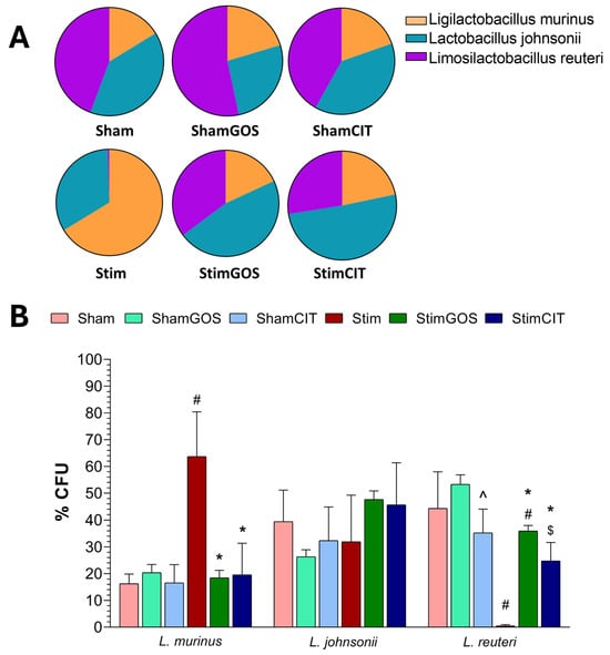 The most abundant bacterial species grown on the blood medium (% of the total CFU of all identified species) in the gut microbiota of rats from individual experimental groups (A). Effects of GOS supplementation or CIT administration on the percentage (% of the total CFU) of the most abundant bacterial species (grown on the blood medium) in the gut microbiota of rats subjected to long-term electrical stimulation of the CeA or sham stimulation (B). Data are expressed as the mean ± SEM; n = 6 animals/group. Explanations: # p < 0.05 stimulated vs. sham rats within the same supplementation group (Stim vs. Sham; StimGOS vs. ShamGOS; StimCIT vs. ShamCIT); * p < 0.05 certain stimulated and supplemented groups vs. Stim; $ p < 0.05 StimGOS vs. StimCIT; ^ p < 0.05 ShamGOS vs. ShamCIT using two-way ANOVA followed by Tukey’s post hoc test.