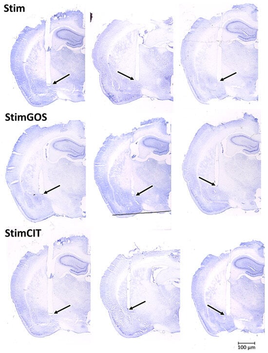 All animal procedures were carried out in accordance with the European Parliament and the Council of 22 September 2010 (2010/63/EU), as well as under the authority of the Local Ethical Committee for the Care and Use of Laboratory Animals at the University of Technology in Bydgoszcz, Poland (decision number 38/2017). According to this decision, the welfare of the animals was monitored during the experiment. The observation of the rats for atypical behaviour (e.g., stereotyped movements, a lack of rearing, etc.) and pain was conducted daily during recovery from stereotaxic implantation, the stimulation period (before stimulation and after returning to home cages) and GOS or CIT supplementation. The body weight, skin, stool consistency, and urinary signs were analysed once a week. The endpoints of the procedure (criteria of early euthanasia for humanitarian reasons) were planned if the body weight loss exceeded 10% or if the animal exhibited behaviours that impaired its ability to perform essential activities, such as free exploration, grooming or food and water intake. Throughout this experiment, no symptoms were observed that would warrant the early termination of the procedure.