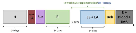 Diagram of the experimental procedures. Explanations: H—handling; basal LA—basal locomotor activity measurement using actometers; Sur—stereotaxic surgery of stimulation electrode implantation to the CeA; R—recovery; 3-week GOS supplementation/CIT therapy started 7 days before the first electrical stimulation of the CeA; ES + LA—electrical stimulation of the CeA using actometers with locomotor activity measurements; Beh—anxiety-like behaviour assessments in the elevated plus maze test after the last stimulation session; E + Blood + IMS—euthanasia, blood and intestinal microbiota sample collection.