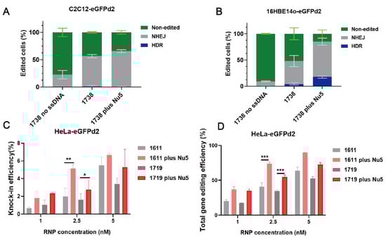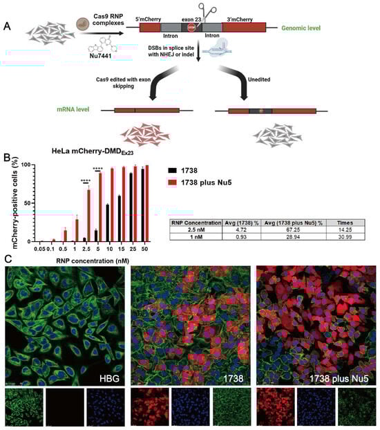 2.4. Exon Skipping Efficiency of 1738 Cas9 RNP Complexes with 5 nM Nu7441 in DMD Exon 23 Reporter Cell Model