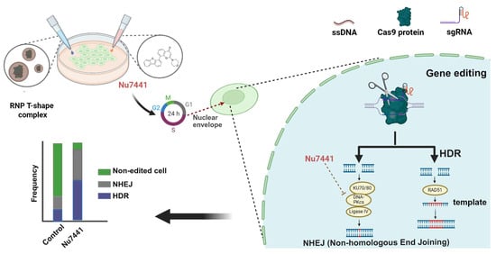 - Robert, F.; Barbeau, M.; Éthier, S.; Dostie, J.; Pelletier, J. Pharmacological inhibition of DNA-PK stimulates Cas9-mediated genome editing. Genome Med. 2015, 7, 93. [Google Scholar] [CrossRef]