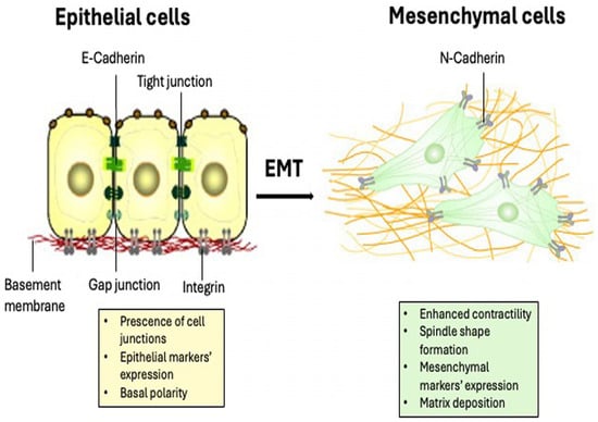During EMT, pivotal events include the loss of adherens junctions and downregulation of epithelial markers like cytokeratins and E-cadherin, accompanied by increased expression of mesenchymal markers such as fibronectin, N-cadherin, and vimentin. This transition results in the acquisition of a fibroblastic invasive phenotype and resistance to anoikis/apoptosis. See Table 1 for a summary of EMT markers [].