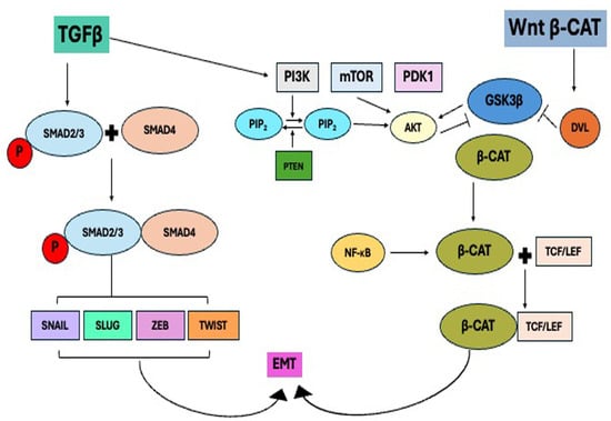 EMT regulation by TGFβ and Wnt signaling pathways. Smad proteins are activated by TGFβ activates to promote transcription of EMT transcription factors such as Snail and Slug. Furthermore, the PI3K/AKT pathway facilitates TGFβ crosstalk with the Wnt pathway. Wnt signaling maintains the expression of β-catenin, which enables it to combine with TCF/LEF to form a transcriptional complex that increases the expression of EMT regulators like Snail, Slug, and vimentin [].