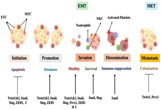 EMT in tumor progression. EMT-inducing transcription factors not only contribute to increasing mobility and migration of cells that cause cancer cell invasiveness but also contribute to multiple important functions that lead to initiation and progression of tumors. The transcription factors inducing EMT abrogate oncogene-mediated senescence and apoptosis during the initial stage of tumorigenesis. These transcription factors also confer stemness in tumor cells and facilitate immunosuppression and cell survival. In contrast, EMT suppression is required in colonization or clonal outgrowth at metastatic sites by down regulation of EMT-inducing transcription factors such as Twist1 and Prrx1 (paired related homeobox 1). Hence, EMT supports the invasive phenotype/phase of cancer metastasis, while MET supports the colonization and formation of metastases in a distant organ [].