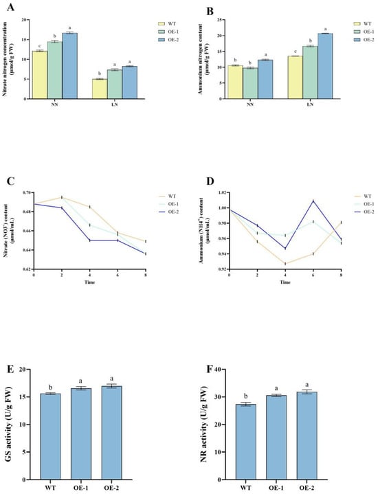 Plants subjected to nitrogen depletion conditions were further treated with depletion solution for 20 days. Under LN conditions, GS activity was significantly higher (p < 0.05) in OE1 and OE2 than in WT, with an 8.6% increase. However, there was no significant difference in GS activity between the two transgenic lines (Figure 2E). Similarly, NR activity was also significantly elevated (p < 0.05) in OE1 and OE2, with both lines showing an 11.6% increase compared to WT, indicating improved nitrate reduction efficiency (Figure 2F). The results of the study showed that the nitrogen assimilation capacity of the OE strain was higher than that of the WT strain.