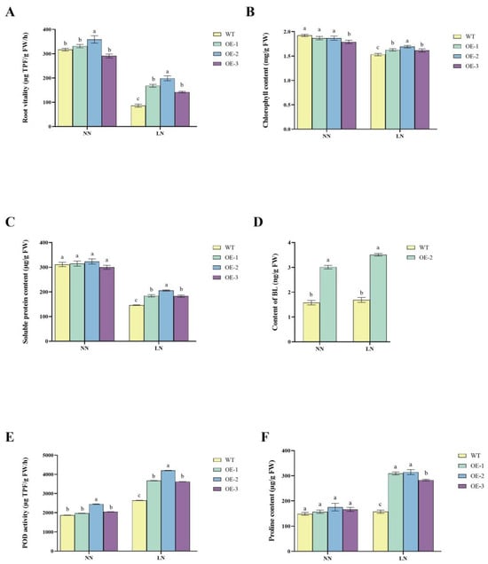 OE2 consistently outperformed WT in root vitality, chlorophyll content, soluble protein content, BL content, POD activity, and proline accumulation, demonstrating its superior nitrogen-use efficiency and stress tolerance. Root vitality, as shown in Figure 4, was higher in OE2 under both NN and LN conditions. Under NN, OE2 displayed a 13.2% increase in root vitality compared to WT, while under LN, the improvement was more pronounced, with a 131% higher value than WT (Figure 4A). This indicates that OE2 maintained better root activity and efficiency under nitrogen-deficient conditions. Chlorophyll content remained similar among all lines under NN, but under LN conditions, OE2 retained significantly (p < 0.05) higher chlorophyll content compared to WT, showing an increase of 10.5% (Figure 4B). This suggests that OE2 plants exhibited improved chlorophyll retention, which is critical for maintaining photosynthesis under nitrogen stress. The soluble protein content was similar across all lines under NN conditions. However, under LN conditions, OE2 maintained significantly higher (p < 0.05) soluble protein levels, showing a 40.6% increase compared to WT (Figure 4C). This suggests that the enhanced ability of OE2 to maintain protein synthesis and stability under nitrogen-deficient conditions contributes to the improvement of low-nitrogen tolerance in potatoes. Additionally, the BL content was significantly higher (p < 0.05) in OE2 than in WT under both NN and LN conditions. Under NN conditions, OE2 exhibited a 90% increase in BL content, while under LN conditions, BL levels were approximately 108% higher than in WT (Figure 4D).