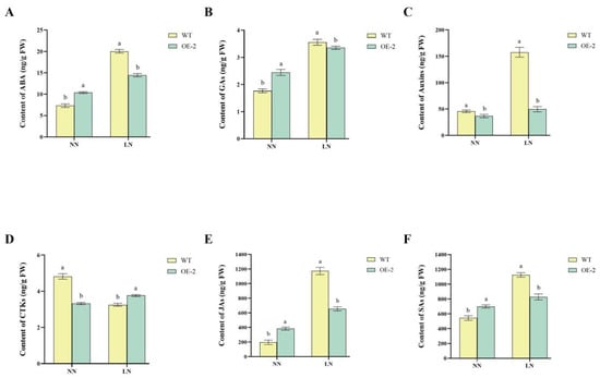 The levels of most endogenous hormones responded dynamically to LN stress. Under LN conditions, the levels of ABA, GA, JA, and SA increased in both OE2 and WT, though the accumulation in WT was significantly higher than in OE2. Specifically, under NN conditions, OE2 exhibited significantly higher ABA levels than WT. Under LN stress, ABA levels increased in both lines, but WT accumulated significantly higher ABA content than OE2 (Figure 5A). OE2 consistently exhibited higher GA levels than WT under both NN and LN conditions, though the difference was more pronounced under NN conditions. Under LN stress, GA content increased in both OE2 and WT, but WT exhibited a significantly higher GA accumulation than OE2, indicating that WT may activate GA-mediated growth responses more strongly under nitrogen limitation (Figure 5B). IAA levels in WT were significantly higher than in OE2 under both NN and LN conditions, with an even greater accumulation under LN stress (Figure 5C). Under NN conditions, OE2 exhibited significantly lower CTK levels than WT. However, under LN stress, CTK levels in WT declined sharply, while in OE2, they remained relatively stable, leading to higher CTK levels in OE2 than in WT under LN conditions (Figure 5D). JA levels were significantly higher in OE2 compared to WT under both NN and LN conditions. However, under LN stress, WT exhibited a significantly higher increase in JA content compared to OE2, suggesting that JA accumulation is a major component of the WT stress response (Figure 5E). Under NN conditions, OE2 exhibited significantly lower SA levels than WT. After LN stress, SA levels increased in both lines, but WT had significantly higher SA accumulation than OE2, reinforcing the idea that WT relies on stronger SA-mediated defense mechanisms in response to nitrogen limitation (Figure 5F).
