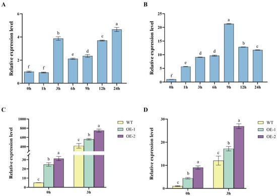The temporal expression analysis of StDWF1 and StGRP1, together with their relative expression in WT, OE1 and OE2, provides compelling evidence for the dynamic regulation of these genes under specific conditions. In the temporal analysis, StDWF1 expression gradually increased over time, reaching its peak at 24 h with a 3.7-fold increase compared to the baseline at 0 h (Figure 6A). The expression of StGRP1 followed a similar trend, peaking at 9 h with a 20.3-fold increase compared to 0 h, before declining by 24 h (Figure 6B).