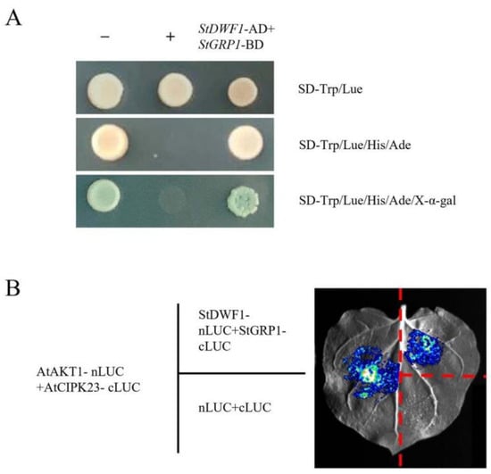 The yeast two-hybrid assay provided robust validation of interactions between StDWF1 and StGRP1, demonstrating their potential functional relevance (Figure 7A). Yeast strains co-transformed with StDWF1-AD+StGRP1-BD showed strong growth on highly selective media (SD-Trp/-Leu/-His/-Ade/X-α-gal), confirming that StGRP1 specifically interacts with StDWF1. In contrast, the negative controls (pGADT7+pGBKT7 and StCBL4-AD+StCIPK23-BD, first and fourth columns, respectively) showed negligible or no growth on the same selective media, demonstrating that the observed growth in the test groups is specific to the interaction of StDWF1 with StGRP1.