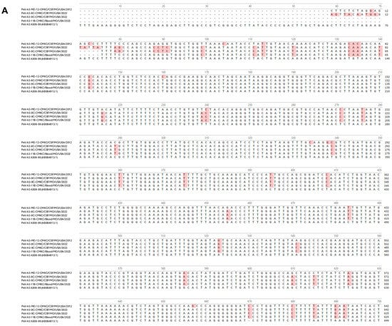 Table 1. A BLASTn analysis provided the highest alignment score for the PeV-A3-MO-12-CMKC/CSF/MO/USA/2012 isolate to the PeV-A3 isolate from Yamagata, Japan (LC864495.1). The PeV-A3-8C-CMKC/CSF/MO/USA/2022, PeV-A3-9C-CMKC/CSF/MO/USA/2022 and PeV-A3-11B-CMKC/Blood/MO/USA/2022 isolates aligned to another PeV-A3 isolate reported from Yamagata, Japan (LC864514.1). When compared with the prototypic sequence of PeV-A3-308/99 (AB084913), we identified multiple nucleotide changes spanning across the 5′ untranslated region (UTR) (
