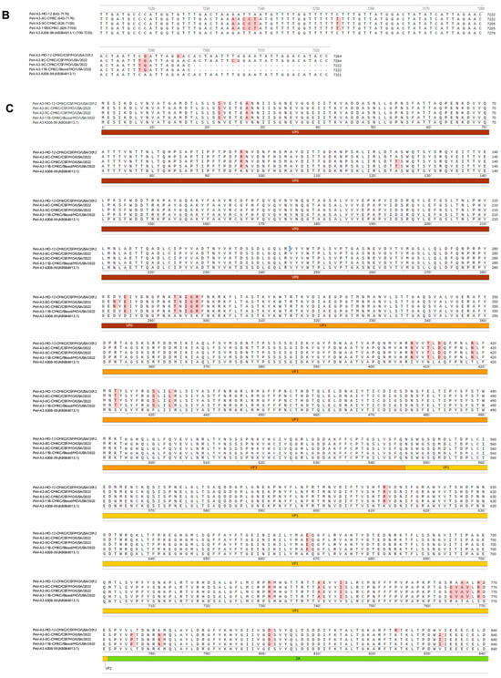 Figure 1A–C). The isolates from 2022 (PeV-A3-8C-CMKC/CSF/MO/USA/2022, PeV-A3-9C-CMKC/CSF/MO/USA/2022, PeV-A3-11B-CMKC/Blood/MO/USA/2022) have unique amino acid substitutions that were absent in the PeV-A3-MO-12-CMKC/CSF/MO/USA/2012 isolate and PeV-A3-A308/99 (