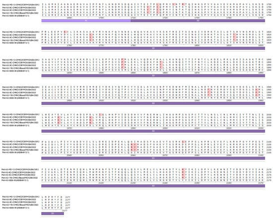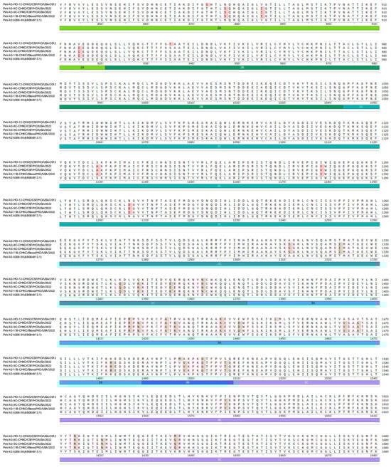 Figure 1C). Unique amino acid substitutions were observed in the PeV-A3 isolates from 2022 (PeV-A3-8C-CMKC/CSF/MO/USA/2022, PeV-A3-9C-CMKC/CSF/MO/USA/2022 and PeV-A3-11B-CMKC/Blood/MO/USA/2022) that were absent in the 2012 isolate (PeV-A3-MO-12-CMKC/CSF/MO/USA/2012). These substitutions were seen in non-structural proteins [2A (L776P, K781N, V832I, N877S, V885I, V915I); 2C (S1129A, I1178V, N1206D, A1311S, T1322I, K1344Q, Q1348K, Q1355E); 3A (S1418N, R1426K, E1440D, A1463V, V1466A, K1482R); 3B (A1498V, S1507T); 3C (I1577V, S1620N); 3D (I1714V, A1766S, S1811T, A1858T, Y1943F, S1958A, E1966D, D1976N, G2059N, I2060V)] and structural protein VP1 (R764G, A765V, A767V) (