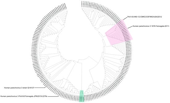Figure 2, highlighted in red). The three isolates from 2022 (PeV-A3-8C-CMKC/CSF/MO/USA/2022, PeV-A3-9C-CMKC/CSF/MO/USA/2022 and PeV-A3-11B-CMKC/Blood/MO/USA/2022) are highly divergent and cluster as a distinct clade in the phylogenetic tree when compared with the closest available PeV-A3 genomes (