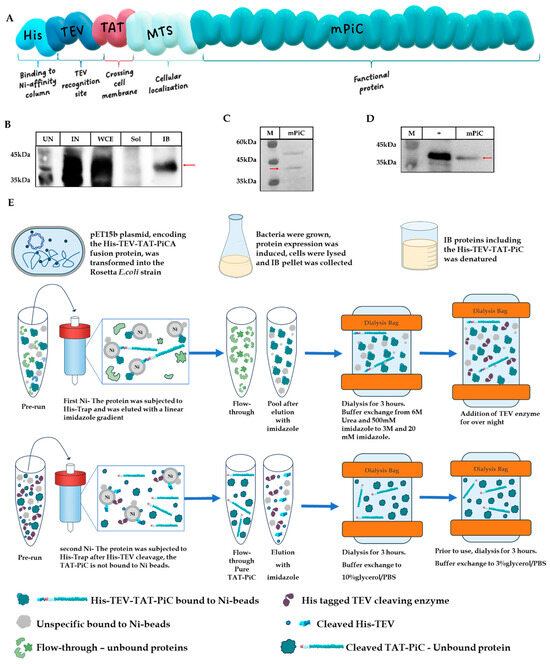 The resulting solution was subjected to a second affinity chromatography His-Trap column (GE Healthcare, Chicago, IL, USA); collecting this time the flow-through of the column-run. The flow-through fraction was subjected to desalting and buffer exchange into PBS containing 10% glycerol, via dialysis; thus, obtaining the TAT-mPiCA fusion protein. The fusion protein was aliquoted and kept at −20 °C. Prior to use, the fusion protein was thawed and dialyzed against PBS containing 3% glycerol for three hours. The protocol for purifying TAT-mPiCA fusion protein is schematically illustrated in Figure 1E. All purification procedures were carried out using the FPLC system ÄKTA (GE Healthcare, Chicago, IL, USA).
