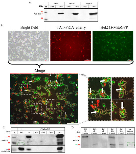 TAT-mPiC fusion protein internalization and processing. (A) Three cell lines (HeLa, HEK293, and HepG2) were incubated with the TAT-mPiC fusion protein for 2.5 h, whole cell lysates from cells with or without the addition of the fusion protein were analyzed by Western blot. (B) Hek293-MitoGFP cells were incubated with TAT-PiCA-cherry fusion protein (20 µg/mL) for 3 h and a fluorescence microscope was used to obtain images. White arrows indicate yellow spots where MitoGFP and TAT-PiCA-cherry overlap. The white boxes indicate the region of interest, which is enlarged in the inset to highlight colocalization. (C) HeLa cells were incubated for 3 h with the fusion protein then the mitochondria were isolated and sub-fractionated and analyzed by Western blot. (D) Isolated mitochondrial inner membranes of treated HeLa cells were incubated for different time periods and protein treatment doses and analyzed by Western blot. IM—mitochondrial inner membrane, Mat—mitochondrial matrix, OM—mitochondrial outer membrane, Cyto—cytoplasm, WCE—Whole cell lysate. Red arrow—42 kDa full length fusion protein, green dashed rectangle—endogenous mPiC protein, green arrow—the 34 kDa processed exogenous mPiC protein.