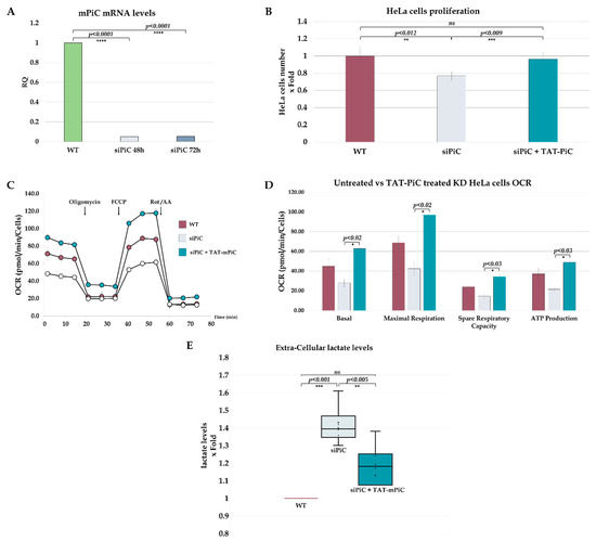 The TAT-mPiC effect on the cells’ energetic profile. (A) Relative quantification (RQ) of mPiC mRNA levels by RT-PCR analysis of HeLa cells exposed to siPiC for 48 and 72 h. HeLa cells were incubated with siPiC for 48 h, 6 µg/mL of TAT-mPiC was added for another 24 h. (n = 3) (B) The cells’ number was evaluated by trypan blue staining after 72 h (n = 6). (C) OCR of WT and siPiC HeLa cells with or without treatment was measured using Seahorse. For statistical purposes, eight independent experiments were performed with at least 4 replicates each. Values are shown as the mean of pmolO2/minute/cell. (D) Quantification of two independent experiments with at least 4 replicates each. All folds were compared to WT cells. (E) The extra-cellular lactate levels were measured, all results were related to WT (=1), each circle represents an individual measurement. The line represents the median, and X represents the average (n = 8). Results are presented as mean ± STD. For statistical analysis, a t test was used (ns p > 0.05; * p ≤ 0.05; ** p ≤ 0.01; *** p ≤ 0.001; **** p ≤ 0.0001).