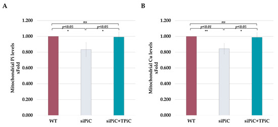 Treatment with TAT-mPiC fusion protein replenishes Pi and Cu levels within the mitochondria. After 48 h of incubation with siPiC, cells were incubated with the TAT-mPiC fusion protein (4 µg/mL) for another 24 h. Cells were lysed, the mitochondria were isolated, the mitochondrial Pi and Cu levels were measured using commercial kits (see Methods). (A) Mitochondrial inorganic phosphate levels (n = 7). (B) Mitochondrial copper levels (n = 4). Results are presented as mean ± STD. For statistical analysis, a t test was used (ns p > 0.05; * p ≤ 0.05; ** p ≤ 0.01).