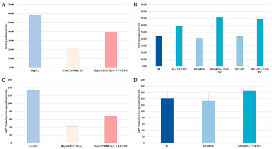 TAT-mPiC fusion protein was added to cells with mitochondrial defects other than MPCD, to examine its possible beneficial effect on these cells’ energy profile. PDH-E1α−/− (Pyruvate dehydrogenase E1 subunit CRISPR knockout) HepG2 cells, which lack the E1α subunit of the pyruvate dehydrogenase complex, as well as GM04078 and GM01673 cells derived respectively from Friedreich Ataxia (FRDA) and Methylmalonic Aciduria (MMA) patients, were treated with the TAT-mPiC fusion protein. Our results show that the basal OCR of HepG2/E1α−/− cells was reduced to 0.35-fold compared to unmanipulated HepG2 cells and increased by 1.87-fold upon treatment with TAT-mPiC fusion protein compared to HepG2/E1α−/−, untreated cells (Figure 5A). The basal OCR of BJ normal fibroblasts, GM04078 and GM01673 cells increased to 1.32-, 1.75-, and 1.57-fold, respectively, upon treatment (Figure 5B).