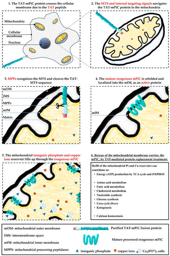 Taking into consideration the main role of mitochondria in cells’ energy metabolism, mitochondrial pH balance maintenance, and the numerous metabolic pathways performed by mitochondria (such as amino acid metabolism, fatty acid metabolism, cholesterol metabolism, nucleotide synthesis, glucose synthesis, urea cycle (liver), ketogenesis, calcium homeostasis, etc. Figure 6, panel 6), it is worth considering conducting a screen to test whether adding mPiC, in the form of TAT-mPiC, to cells suffering from mitochondrial deficiencies other than MPCD, can moderately increase mitochondrial Pi and Cu levels and consequently benefit these cells. Our results show that the carrier’s activity can affect the energy profile of cells of patients that have deficiencies in PDHE1a, FXN, and MMA (Figure 5A–D). This suggests that more Pi and Cu inside the mitochondrial-matrix contribute to many other mitochondrial activities (Figure 6) requiring mainly Pi (but also Cu), and thus may be curative for the down-stream defects caused by various gene deficiencies. This finding is remarkable and could suggest the TAT-mPiC fusion protein as a potential treatment combined with other supplements and drugs to treat various diseases characterized by low mitochondrial ATP production. However, these preliminary results should be further evaluated in follow-up studies.