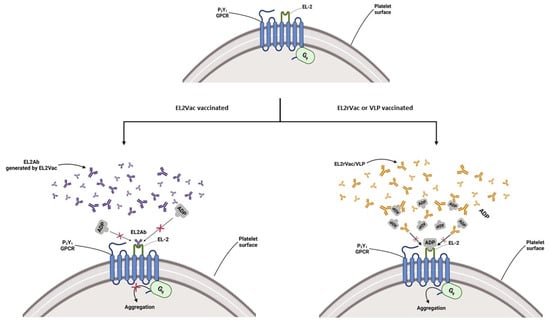 Since previous studies showed an altered platelet count due to vaccine-induced immunoresponses [,,], we sought to determine whether EL2Vac would produce any effects. The results indicated no significant difference in the platelet counts between the EL2Vac mice, in comparison with the EL2rVac and VLP groups, suggesting that EL2Ab production and interaction with the P2Y1-R do not affect the platelet life span (Table 2).