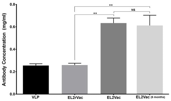 Antibody concentration in mice vaccinated with EL2Vac, EL2rVac, or VLP. Mice were immunized with VLP coupled with the EL2 sequence (CGGTGVRKNK-TITCYDTTSDEYLRSYF; T192-F215), random EL2 (LYKDGTICTYVFYNKRRSDTETST), or VLP. EL2Ab, which was measured, including after six months, in the vaccinated mice using ELISA and the EL2 cognate peptide, was detectable at significant levels in the EL2Vac mice, but not the EL2rVac and VLP controls. The titers were assessed in five distinct vaccination groups, each comprising five mice (** p ≤ 0.001); the abbreviation NS denotes insignificance (p ≥ 0.05).