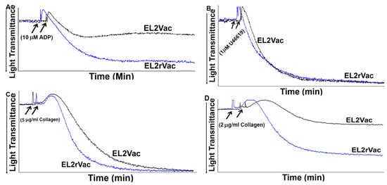 Platelet aggregation assessment in the vaccinated mice. Platelets were obtained from mice vaccinated with 20 µg of EL2Vac or EL2rVac and stimulated with three different agonists, (A) 10 µM ADP, (B) 1 µM U46619, (C) 5 μg/mL collagen or (D) 2 μg/mL collagen before their aggregation response was measured in a lumi-aggregometry system. EL2Vac showed selective inhibition of ADP- and low-dose collagen-induced platelet aggregation. Each test was performed in triplicate using three separate groups, with blood pooled from six mice per group each time.
