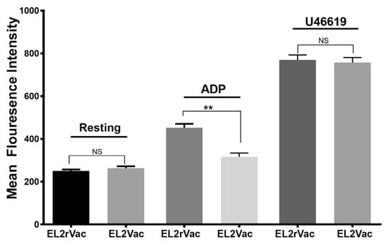 P-selectin expression assessment in the vaccinated mice. Platelets were obtained from mice vaccinated with EL2Vac or EL2rVac and stimulated with two different agonists, 10 µM ADP or 1 µM U46619, before their alpha granule secretion/P-selectin expression was measured using flow cytometry. This experiment was conducted in triplicate, and blood was collected from eight mice and pooled per group. The error bars represent the SEM, whereas NS denotes insignificance (** p ≤ 0.001).