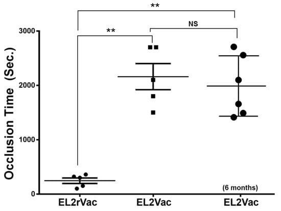 Occlusion time in the vaccinated mice. Mice vaccinated with EL2Vac or EL2rVac were subjected to the FeCl3-induced carotid artery injury thrombosis model. The time for occlusion was found to be delayed in EL2Vac, unlike EL2rVac, and it persisted six months later. Each point represents a single animal (n = 5 for EL2rVac and EL2Vac, and n = 6 for the EL2Vac 6-month experiment); NS denotes insignificance, ** p ≤ 0.001.