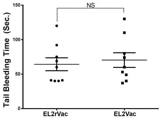 Tail bleeding time in the vaccinated mice. Mice vaccinated with EL2Vac or EL2rVac were subjected to the tail bleeding time assay. The bleeding time was not impacted in the EL2Vac or EL2rVac mice. Each point represents a single animal (n = 9 for EL2rVac and EL2Vac). The abbreviation NS denotes insignificance (p ≥ 0.05).