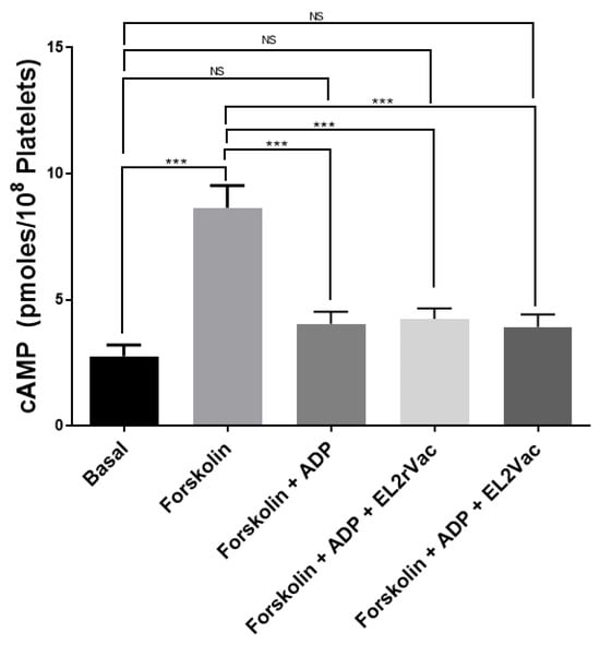 Our results do not address whether EL2Vac interacts/interferes with P2Y12-R-mediated platelet activation. To address this issue, we assessed the capacity of EL2Vac to inhibit ADP-mediated reduction in cAMP in the presence of forskolin, as we previously described []. Our results showed that neither EL2rVac nor EL2Vac exerted any effects on the ability of ADP to lower the cAMP levels that are elevated using forskolin [] (Figure 7).