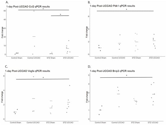 2.4. Alterations in Hypoxia-Related Gene Expressions One Day Post UCCAO in STZ Mice