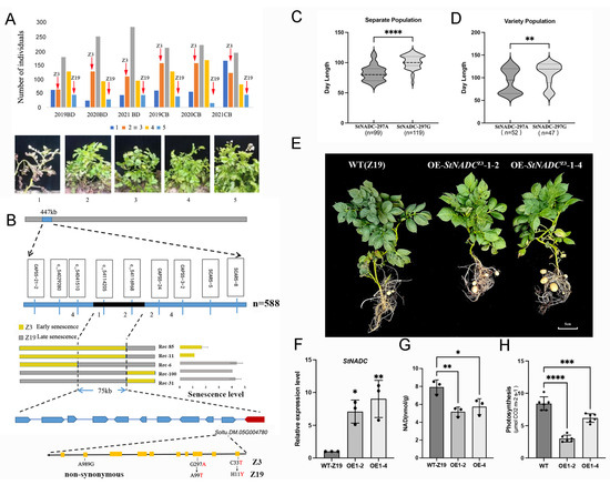 Genetic Basis of Senescence in Potato. The genetic regulation of potato senescence has been a focus of research for decades. Early studies identified the El (Early Inactivation) locus as a major Quantitative Trait Locus (QTL) for senescence, located on multiple chromosomes (II, IV, V, VII, X, XI, and XII) and associated with traits such as plant height, tuber formation, and disease resistance [28,29]. However, the primary QTL for maturity is consistently mapped to chromosome V, suggesting polygenic control of senescence [30,31]. Despite these advances, only a few senescence-related genes, such as StCDF1 [8] and StABI5 [32], have been cloned in potatoes. The molecular mechanisms underlying senescence in tetraploid potatoes remain largely unexplored. In this study, we fine mapped a senescence locus to a 75 kb region on chromosome V, distinct from previously reported loci such as StCDF1. This interval contains StNADC, a key gene regulating senescence through the NAD biosynthesis pathway.