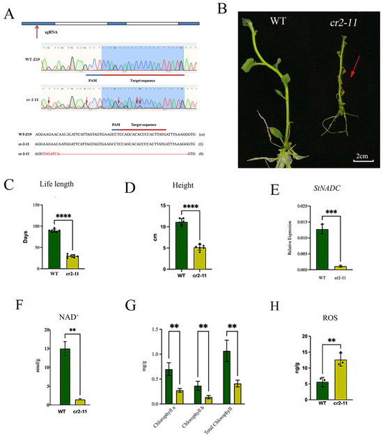 The StNADC gene plays a vital role in plant senescence and is indispensable for NAD synthesis. The green bar indicate the wilde type Z19, The yellow bar indicate cr2-11. (A) The gene structure of StNADC and the mutation patterns in T0 transgenic plants: sgRNA—single guide RNA; WT-Z19—wild type (tetraploid potato variety “Z19”); Cs—conserved sequence of StNADC gene in wild type. (2) and (8) represent the number of clones in mutant cr2–11. (B) The growth status of the wild type and cr2–11 in MS medium at 30 days after propagation (DAP), The arrow indicates significant senescence of cr2-11. A minimum of 36 plants were considered for recording observations in each experiment. The experiments were repeated more than three times with similar results. The scale bar is 2 cm. (C,D) The life length (C) and height (D) of the wild type and cr2–11. (E) The relative expression levels of StNADC for the WT-Z19 and mutant cr2–11. The y-axis represents the StNADC expression level that is related to the internal control gene EIF-3e. The error bars represent the standard error of three biological replicates. (F) NAD content of wild-type and cr2–11 mutant at 30 DAP. (G,H) Leaf contents of chlorophyll a, chlorophyll b, and total chlorophyll (G) and ROS (H) of wild type and cr2–11 mutant at 30 DAP. The data of (C–H) indicate the mean values. Error bars refer to the standard deviation (SD) of three biological replications. **** p < 0.0001, *** p < 0.001, ** p < 0.01 or cr2–11 compared with WT. The data were analyzed using one-way ANOVA.