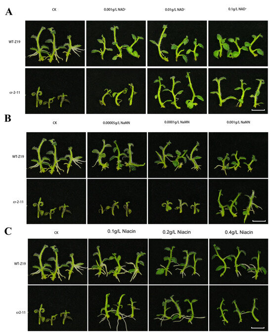 Appropriate concentrations of NAD+ and its intermediates in the NAD+ synthesis pathway can refresh cr2–11 growth normally: (A) NAD, nicotinamide adenine dinucleotide. (B) NaMN, nicotinic acid mononucleotide. (C) Niacin, subtract of salvage pathway. CK, MS medium without niacin. The scale bar was taken as 1 cm.