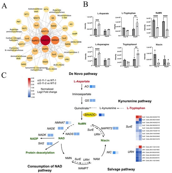 Knockout of StNADC has devastating effects on NAD synthesis and activates plant senescence and tuberization pathways. (A) Co-expression network of key genes in the NAD pathway. Pearson’s correlation coefficient values were calculated for each gene. The strength of the connection is represented by the size of the circle. (B) The metabolites related to StNADC in cr2–11 and the wild type at Day 15 and Day 30 after propagation. **** p < 0.0001, *** p < 0.001, ** p < 0.01 (C) A simplified representation of the NAD biosynthetic pathway. The square heat map represents the transcriptional data related to NAD metabolism in transgenic (cr2–11) and WT plants. The normalized gene expression values [log2(FPKM+1)] were used to plot the heat maps.