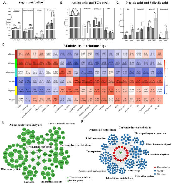 WGCNA reveals metabolic networks influenced by the StNADC gene. (A–C) Metabolic characteristic of cr2–11 mutant. Relative metabolite contents of leaves at Days 15 and 30 are given together with change over time, **** p < 0.0001, *** p < 0.001, ** p < 0.01, * p < 0.05, (wild type: dark-gray bars; cr2–11: light-gray bars). Histograms show the relative amounts of soluble sugars (A), DNA damage intermediates and Salicylic acid (B), and amino acids and TCA circle intermediates (C). (D) Relationship between the modules and metabolites. (E) Co-expression network of downregulated genes module (green) with decline metabolites. (F) Co-expression network of upregulated genes module (blue) with elevated metabolites. Metabolites, structural genes, and TFs are marked in diamond, circle, and square shapes, respectively.