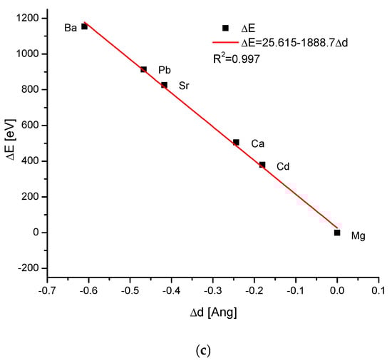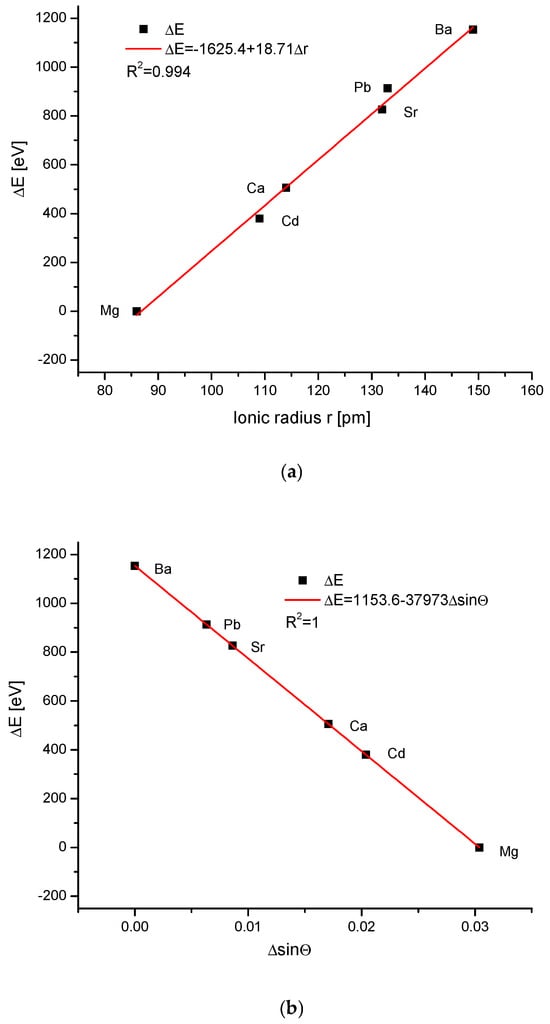 The energy increments calculated according to Equation (1) were linearly correlated with the magnitude of the ionic radii (Figure 1a). The result is even more impressive due to the fact that the results were totally independent of each other—the structural studies of apatites were made in different laboratories and by the use of totally different methods than the measurements and calculation of ionic radii. The latter were estimated as a rule from the thermochemical experiments and calculations. As we know from our earlier studies, such a linear relationship is by no means common in the case of different isomorphic series []. The linearity (or another simple functional relationship) together with the close to 1 value of the coefficient of determination R2 testify that the compound belongs to one family of apatites and to the same crystallographic system. The unavoidable scatter of results if they are supported by the data from different authors/laboratories (see column References in Table 1) transformed in very small shifts on the curves. The shifts were so small that they did not disturb the natural order of the elements resulting from the Periodic Table. The dependences of the energy changes against the changes in the values of sinΘ (Figure 1b) and d (Figure 1c), the universal crystallographic parameter, respectively, were simple and elegant linear functions. The values of the coefficients of determination, extremely close or even equal to 1, testify that we can indeed talk about the functional relationships. The passing from the lightest element Mg to the last one Ba resulted in the decrease in values of Δd, and each increment of Δd corresponded to the relevant positive increment of ΔE.