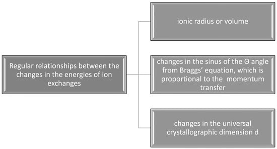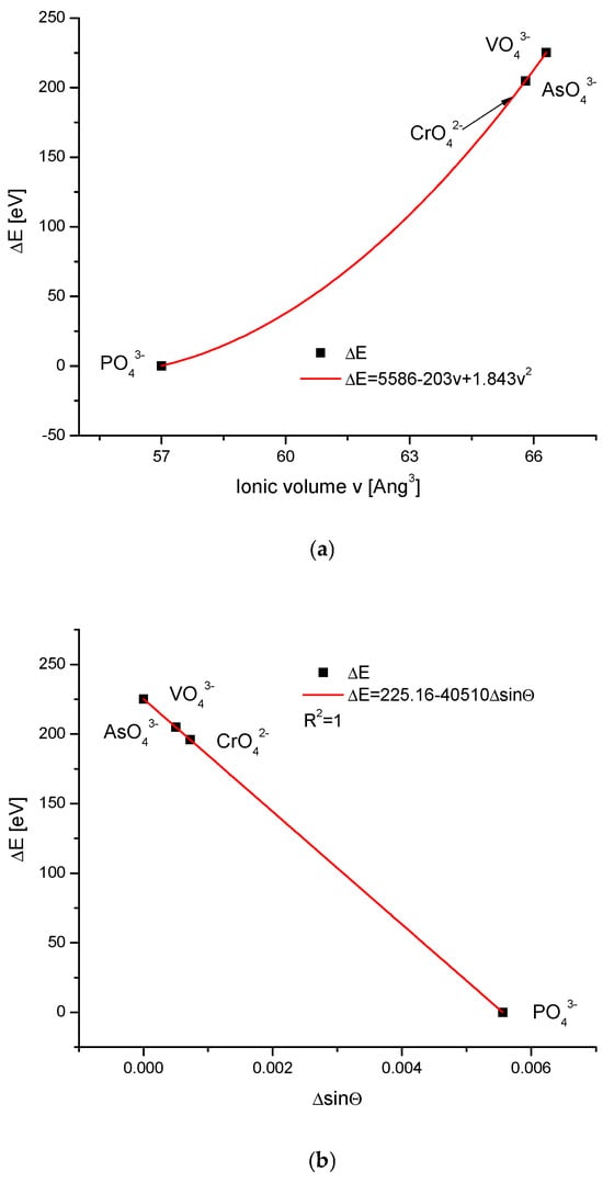 While the values of the ionic radii used in Figure 1 and the volumes of simple anions used in the further text, concerning the ion exchanges in the channel positions, did not generate serious doubts concerning the quality of the data and could be easily cross-checked, the values of complex oxoanions of the type XO4n− were widely scattered, even in the publications by the same authors [,,,]. We decided to select the data from the position by Glasser and Jenkins [] since it was the only option, which was consistent with the crystallographic relationships of the changes in the energy against the changes in the values of sinΘ and the universal crystallographic parameter d; otherwise, these data seemed to be most reasonable. The two latter diagrams in Figure 2 present the regular, functional (linear) relationships, similar as for the cations. The dependencies of energy changes on the ionic volume obeyed the polynomial quadratic function. All that implies the value of the volume of CrO42− as ~65Å3. This value was missing in the data by Glasser and Jenkins [], and was very variable in other publications. The polynomial relationship indicates that the anionic ion exchanges were more complicated than their cationic counterparts. A great difference was observed between the data concerning the phosphates and all other heavier anions.