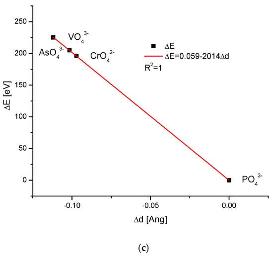 (a) The relationship between the change of the energy during the anionic ion exchange in the apatites and the anionic volumes, with the latter ones taken from Glasser and Jenkins []; (b) the coupling between the energy changes and the difference in the sinΘ values); (c) the dependence of the energy changes during the ion exchanges and the change in the universal crystallographic parameter d. The arrow in Figure 2a shows the postulated value of CrO42− ionic volume.
