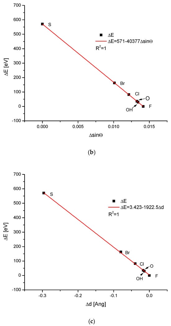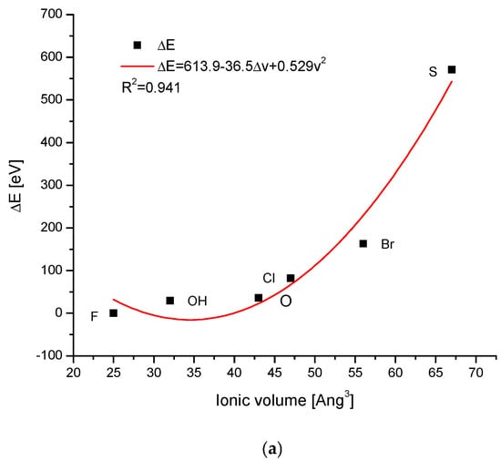 The ion exchanges in the channel positions involved many interesting anions. The dependence of the energy changes on the ionic volumes was quite regular, being the polynomial of the second degree, with somewhat greater scattering than in the previous cases (Figure 3a). The relationships of the changes in the energies during the ion exchanges against the changes in the sinΘ or d parameter were linear (Figure 3a,b), as in all previous cases. It is worth noting that on the first curve, the observed distance of ionic radii between OH− and O2− ions was relatively large, while the change in the energy of ion exchange was very small. On the two remaining diagrams, the differences between the two mentioned ions were hardly noticeable. The sulphur version of the apatite diverged very seriously from other species but still belonged to the same family of isomorphic substances.