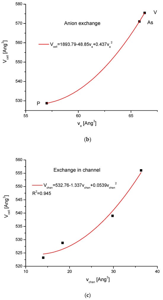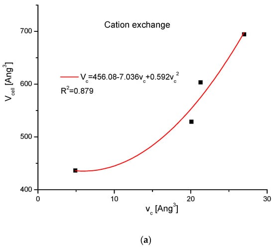 It is interesting to trace how the total volume of the crystallographic cell changes together with the change of volumes of the introduced ions. The values of ion volumes are estimated mainly using thermochemical calculations. Still, the results are highly divergent among different authors and even in the different papers of the same team. In this situation, we decided to use the uniform results from one paper by Glasser and Jenkins [] only, in order to avoid confusion. The base of the data is shown in Table 2. The results are shown in Figure 4a–c. As one could expect, the correlation is positive in each case—however, the results are not identical. All correlations are the polynomials of the second order.
