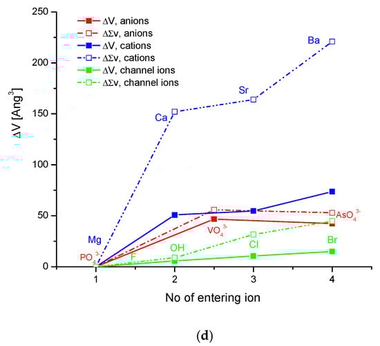 Crystallographic cell volume changes after the introduction of substituted ions in the positions of (a) main cation; (b) anion; (c) channel ion; (d) comparison of net real cell volume increase to the summary volume difference of substituted ions in relation to the original ones, ∑v.