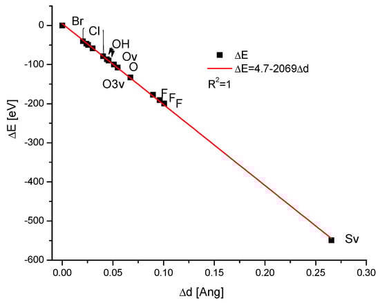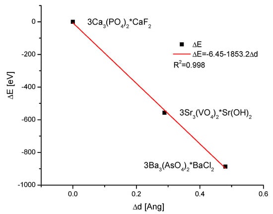 Another fact testifies to the universality of Equation (1f). If we imagine the wildest ionic exchanges inside the group of apatites, e.g., from 3Ca3(PO4)2∙CaF2 to 3Sr3(VO4)2∙Sr(OH)2 and finally to 3Ba3(AsO4)2∙BaCl2, where all the ions were exchanged step by step, we will still have the proper diagram ΔE vs. Δd (Figure 10).