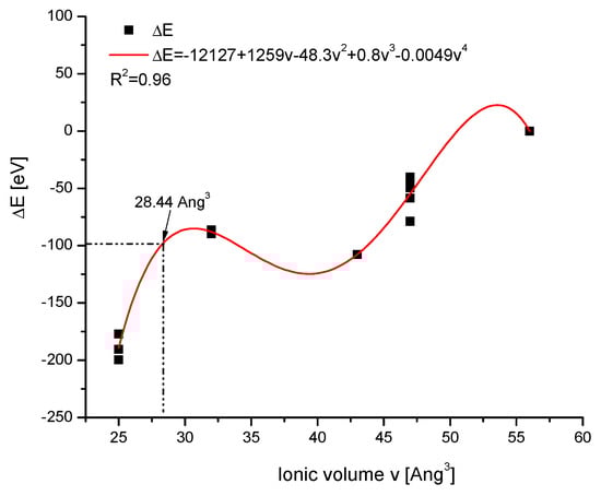 Then, the diagram of the dependence of the energy of ion exchanges on the volume of entering ions was created from the data of Table 3, for which the known values of the ionic volumes were determined. This time, the relationship was somewhat more complicated, but it managed to approximate it by the polynomial of the fourth power with sufficient accuracy. In the next step, the relevant point was put on the curve (Figure 6), determining the postulated volume of the complex O□. It was 28.44 Å3. We can compare it with OH−—32, O2−—43, and O22−—52 Å3 volumes. One can compare the results with the effects joining the introduction of real greater ions into the crystallographic set—it was always swelling. Here, for the defects, one observes the shrinking of the space covered by the agglomerate O□. Using the approximation given in Figure 6, one can determine the value 20.3 Å3 for the S□ agglomerate. It is interesting that Goldenberg et al. [] estimated the volume of a single fragment of apatite channel as not greater than 30 Å3. One can set it with the values S2—67, SH—57 Å3. Each time, the significant shrinking of the agglomerates is noticeable in comparison with the real ion packing.