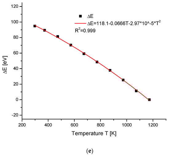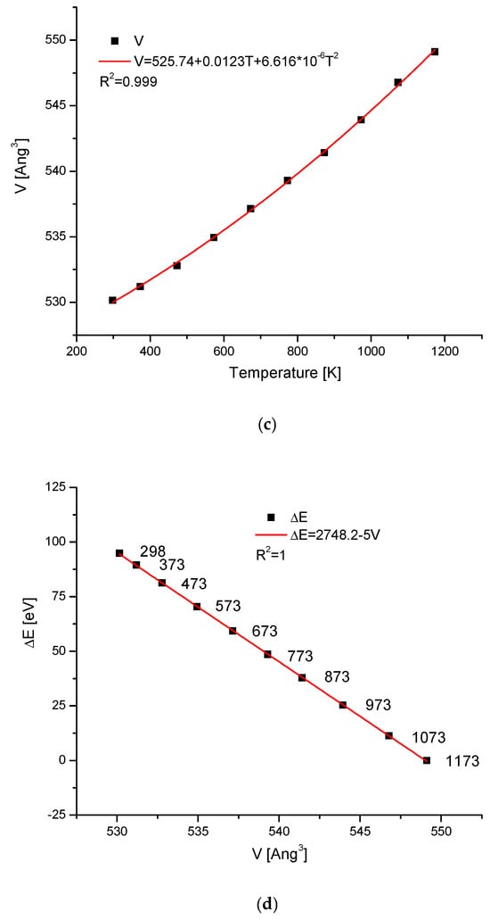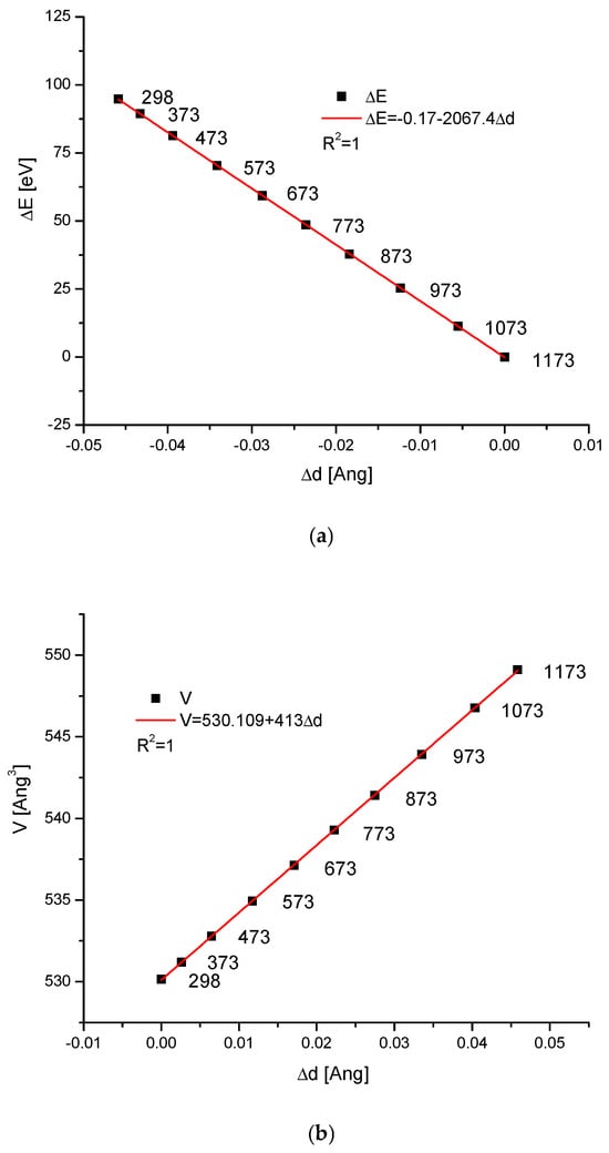 We know that during temperature action on the hydroxyapatite, as well as on the other apatites, the crystallographic dimensions of the cells change. At the same time, the direction of changes is towards the sharpening of peaks in the spectra and more clear crystallisation. Sometimes, as a result of increasing temperature for different compounds, the phase change starts. It is interesting how the energy changes during these processes for the hydroxyapatite. We consider the case where the temperature action was observed and the resulting compounds were still located in the group of isomorphic chemicals. The data about the thermal expansion of hydroxyapatite were given in the paper by Knyazev et al. [] (see Table 4). This situation is typical for the case without the phase change during the heating process. As one can observe, some results seem to be intuitive. For example, both the cell volume and the d parameter increased with the temperature growth (Figure 7b,c, respectively). One can even imagine that we could extrapolate the relevant values for the temperature of 0 K. In that situation, the ΔE value can be treated as the work of compression if one goes from higher to lower and lower temperatures (Figure 7a,d). It concerns the situations without phase transformations at a given range of temperatures. It is astonishing that both ΔE vs. Δd, ΔE vs. ΔV, and in this situation, ΔV vs. Δd relationships are all strictly linear ones.