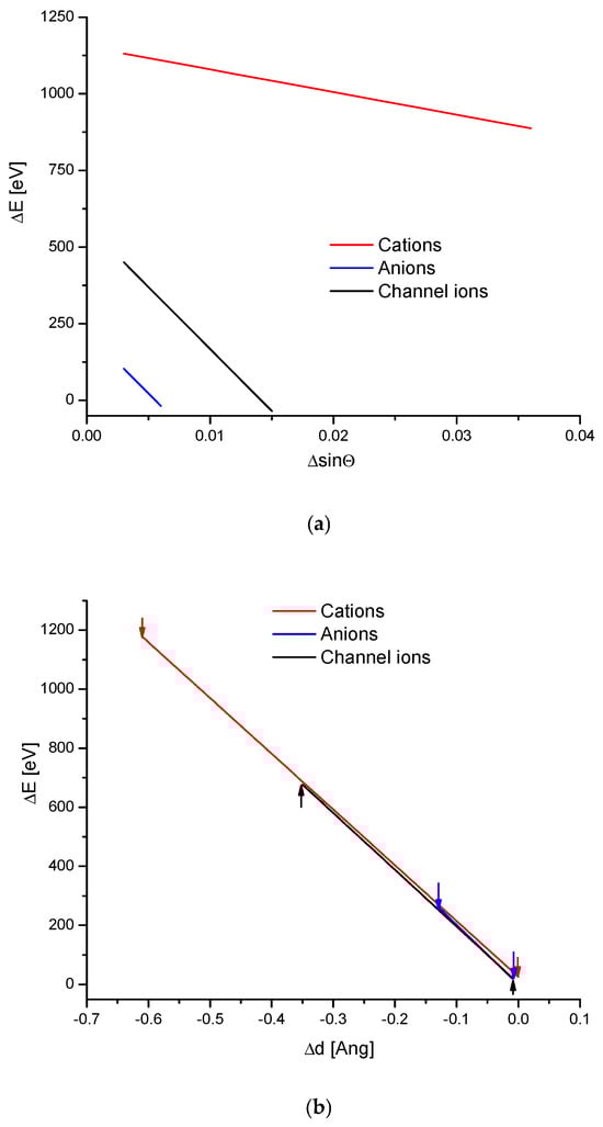 The important question is the calculation of the energies connected with the ion exchanges of different ions inside the crystallographic cell. The relevant equations were derived from Braggs’ equation, in the energy and not the wavelength representation. To derive them, one can imagine that some standard sample can be measured in position of Θ1 with the excitation energy E1, which means that the Braggs dimension is d1. Let us change the sample and then the measurement is in position Θ2, while the exciting energy is still E1 and new Braggs dimension is d2. Both situations are expressed by the relevant Braggs equations. One can ask what happens if we put the value Θ2 in the first equation. Then, we will have the new value of E2. Subtracting the left sides, we will have Equation (1a). It expresses the energy difference connected with the change of the crystal structure. The full set of possible-to-derive equations is as follows [,]: