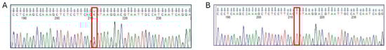 Sequencing of all seven GLA exons and the adjacent 5′ and 3′ exon–intron boundaries identified the D313Y variant in exon 6 (Figure 1), as well as the genetic variation g.1170C>T in the flanking 5′ UTR in patient 1 only. The alpha-galactosidase activity in leukocytes was within the normal range in both patients (14.9 µmol/L/h), whereas in patient 2, it was reduced by 30% in the plasma (22 nmol/mg). Plasma lyso-Gb3 levels, an additional marker of AFD, were within normal limits (0.9 ng/mL). []