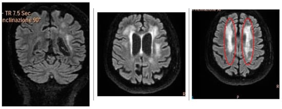 A 49-year-old woman had been complaining of burning pain and paresthesia in her hands and feet for several years. The patient’s son reported that the patient had progressive difficulty walking for approximately 4 to 5 months until she became completely bedridden. For this reason, in February 2020, the patient presented to the Neurology Stroke Unit Hosp. of the Murgia “F. Perinei” of Bari, Italy. At the time of admission, the physical examination showed mild dysarthria, hyposthenia of the lower limbs, and hyperreflexia of the osteotendinous reflexes of the lower limbs. The bilateral Babinski reflex test was positive. MRI of the brain was performed, and the patient’s clinical symptoms required the performance of appropriate diagnostic procedures, including biochemical and genetic analyses. Brain MRI showed multiple disseminated, hyperintense T2 signal changes in the bihemispheric periventricular subcortical white matter, posterior arm of the internal capsule, bilaterally, in the midbrain, and middle cerebellar peduncles (Figure 2). MRI of the spinal cord was normal.