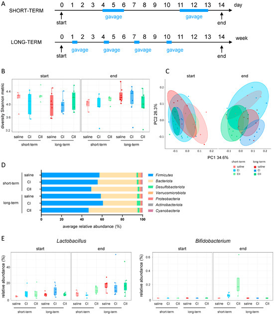 Effects of probiotic administration on intestinal microbiota in healthy mice. (A) Experimental design: mice received composition I (CI), composition II (CII), or saline for short-term (2 cycles over 2 weeks) or long-term (4 cycles over 14 weeks), once daily by oral gavage; (B) alpha diversity (Shannon metric index); (C) beta diversity (weighted UniFrac); (D) relative abundance of phyla at the end of experiment; (E) probiotic abundance: Lactobacillus and Bifidobacterium genus.